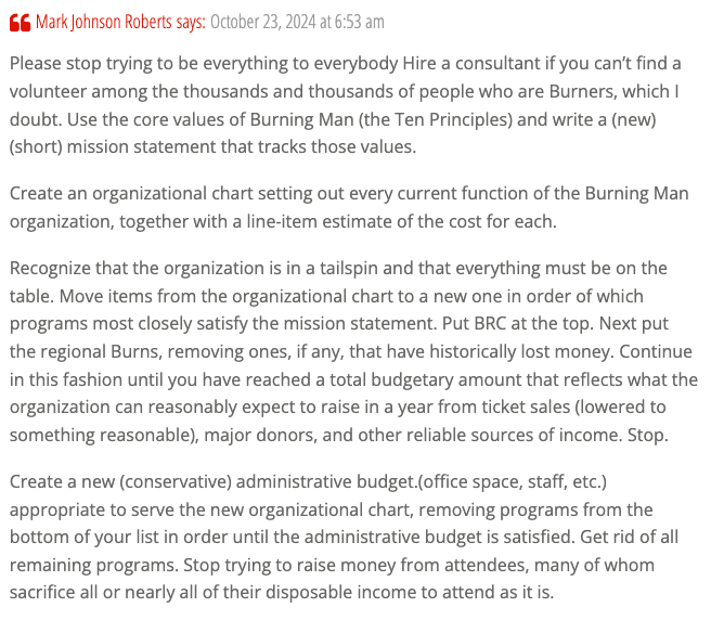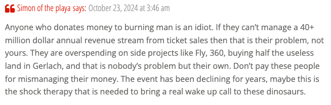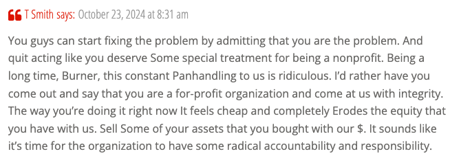In the comment section of Goodell’s blog post, Burners called-out the organization for mismanaging their money and offered possible solutions: