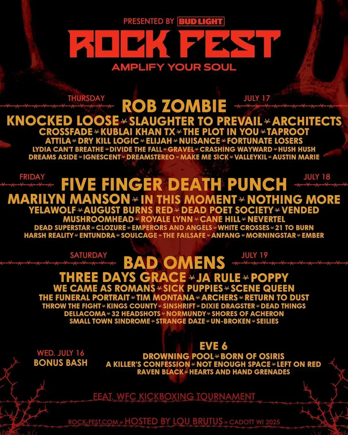 Wisconsin’s Rock Fest has revealed its 2025 lineup, featuring headlining performances from rock’s Rob Zombie, metal’s Five Finger Death Punch, and metalcore group Bad Omens.