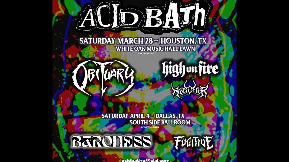 In Houston, Acid Bath will be joined by Obituary, High on Fire, and Necrofier. The Dallas bill includes Baroness and Fugitive, the latter featuring members of Power Trip.